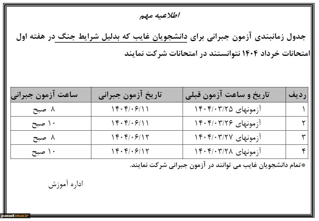 امتیاز دهید : جدول آزمونهای جبرانی برای غایبین امتحانات نیم سال دوم 1403 2 یکشنبه 9 شهریور 1404 ساعت 7:59