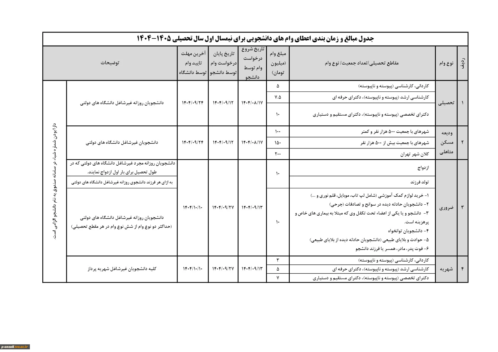 امتیاز دهید : جدول مبالغ و زمان بندی اعطای وام های دانشجویی برای نیمسال اول سال تحصیلی 1405 - 1404 2 شنبه 24 آبان 1404 ساعت 13:38